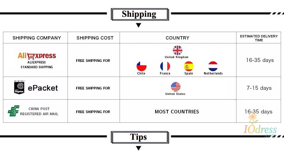 2. Processing time: In order to guarantee the quality of our products, Iodress.com has to prepare your goods carefully before they are shipped out. Our professionally trained technicians perform strict in-house quality control checks on all products and carefully package your items to ensure they arrive in excellent condition.