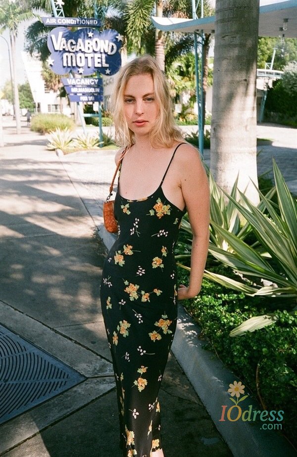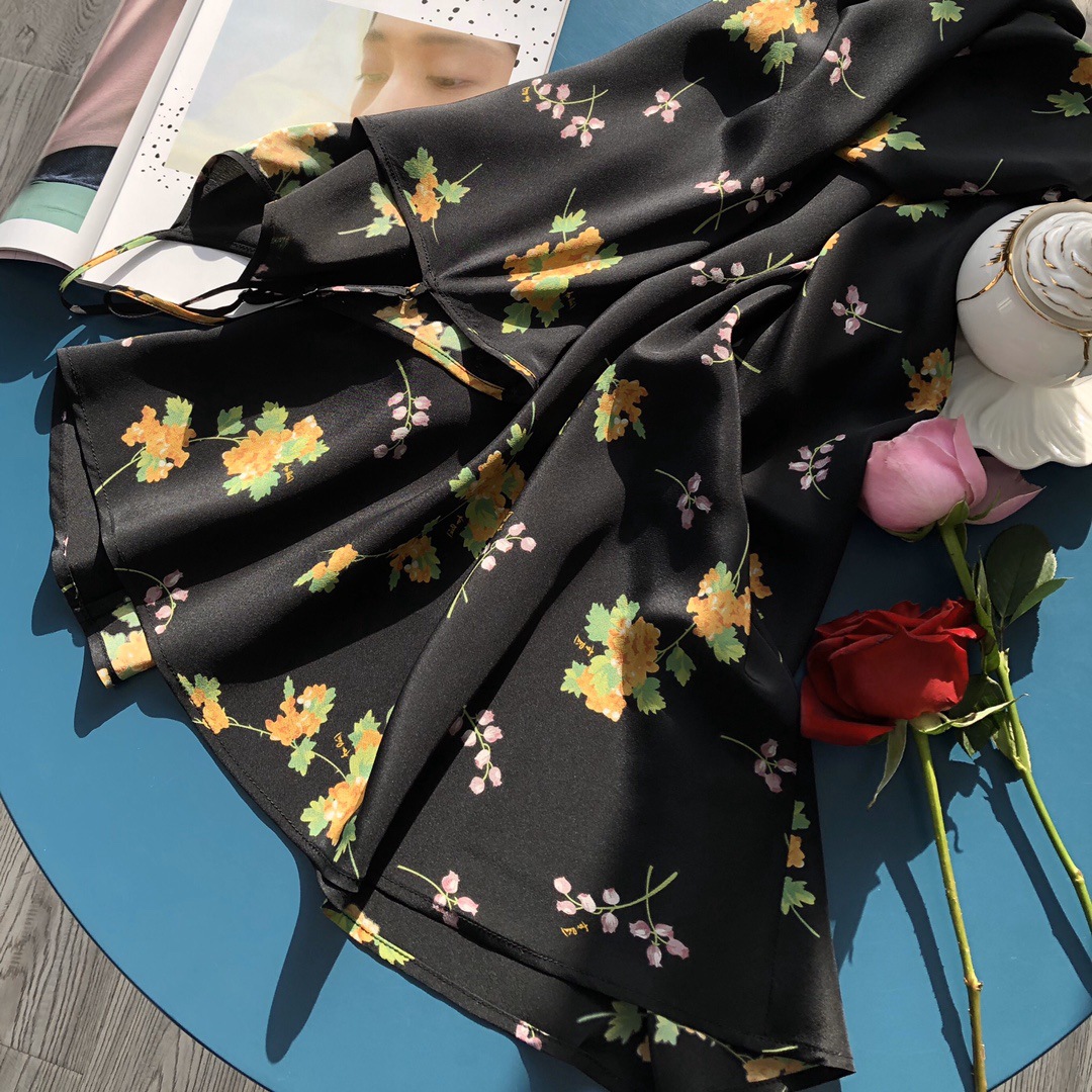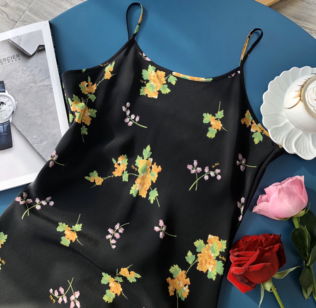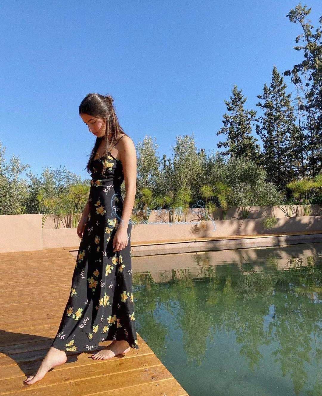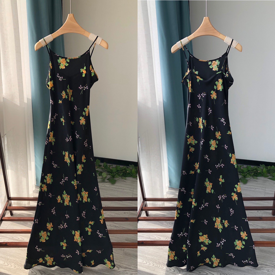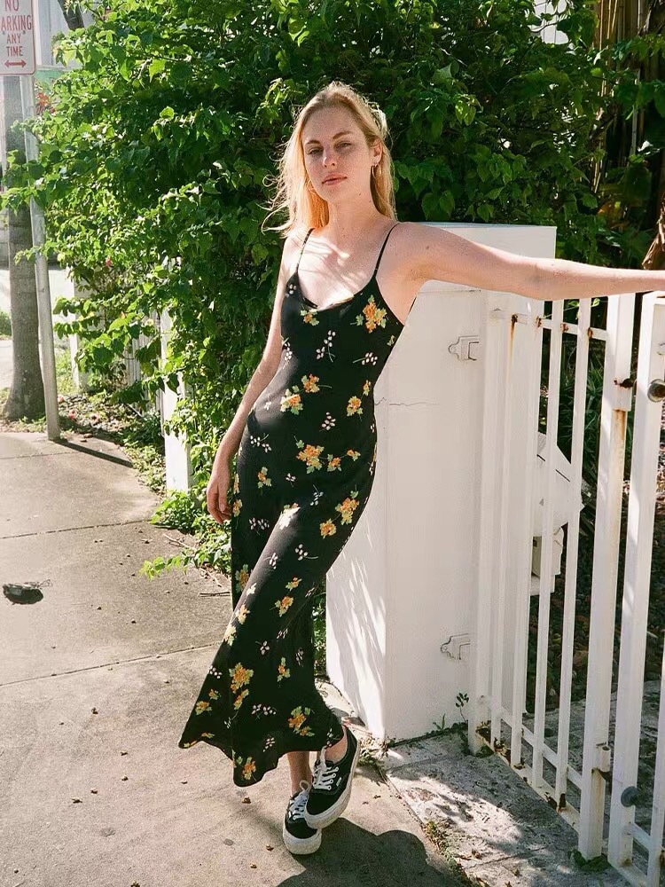 Minimalist route pays more attention to the sense of curves, silk wind chime flower printed suspender long dress