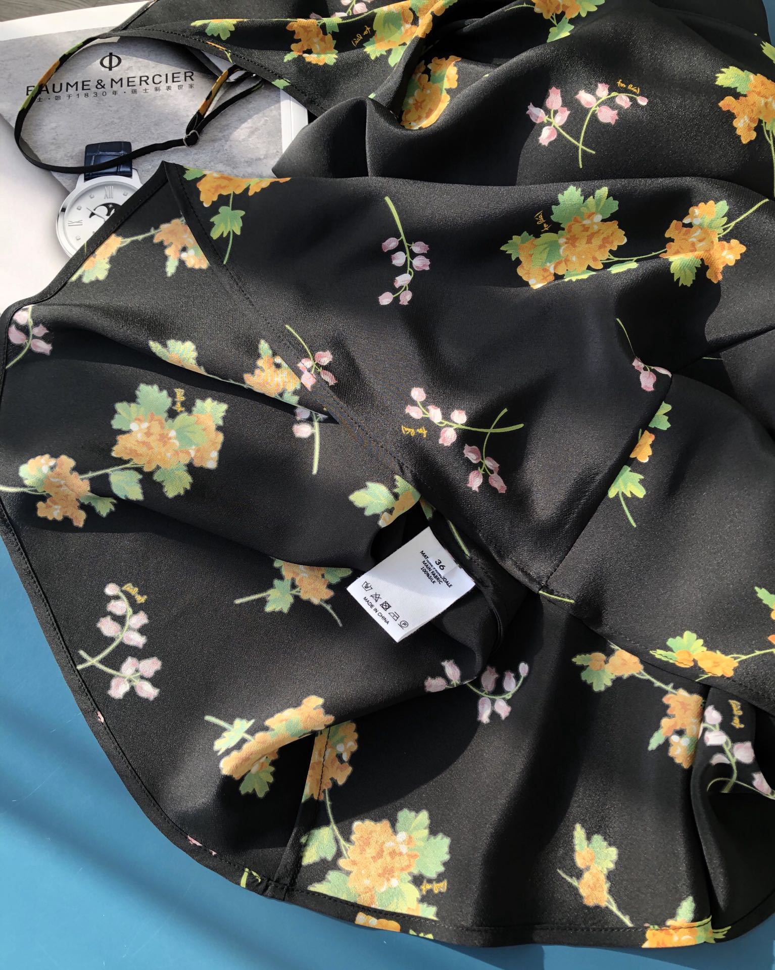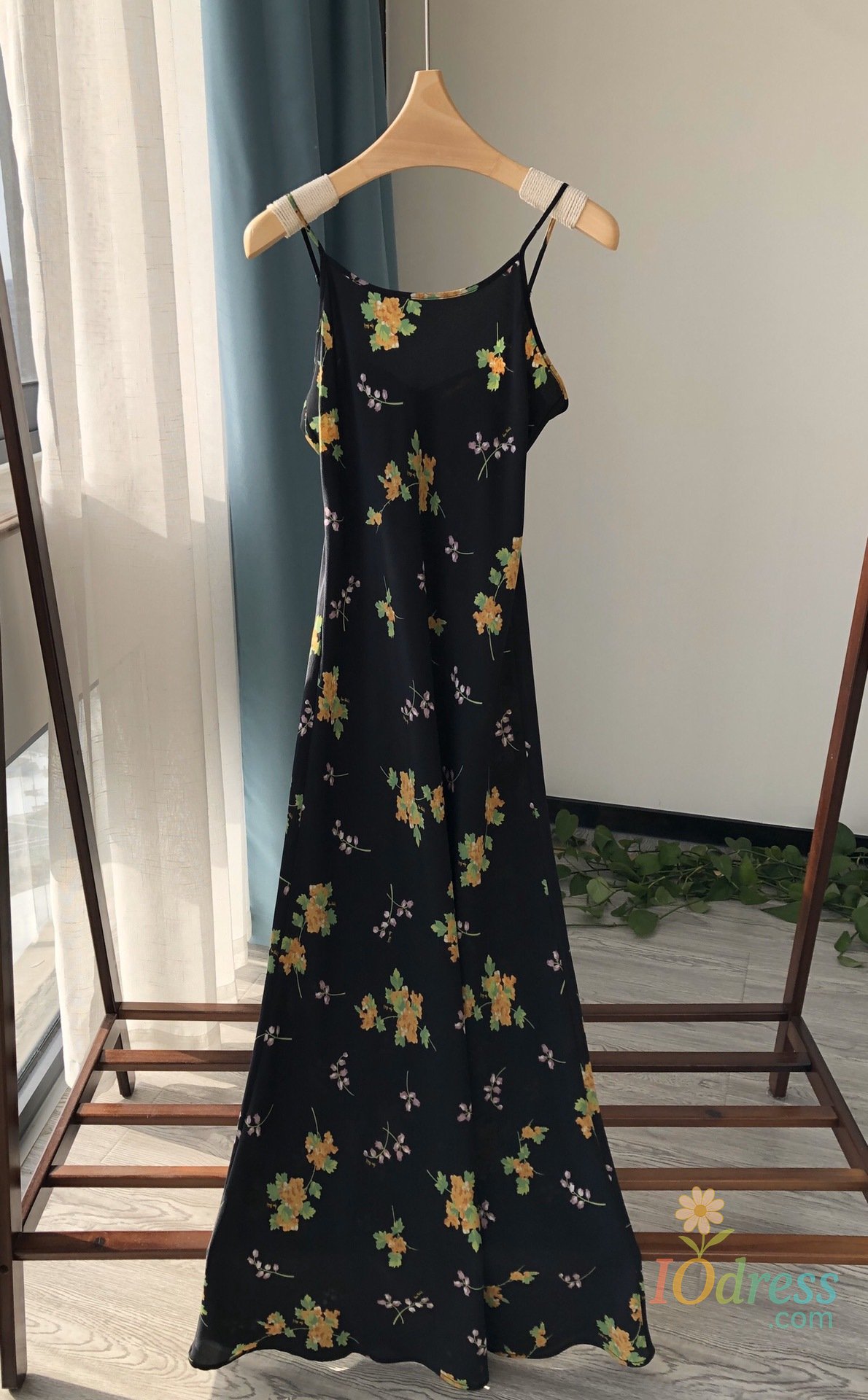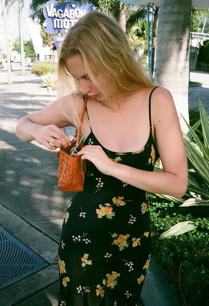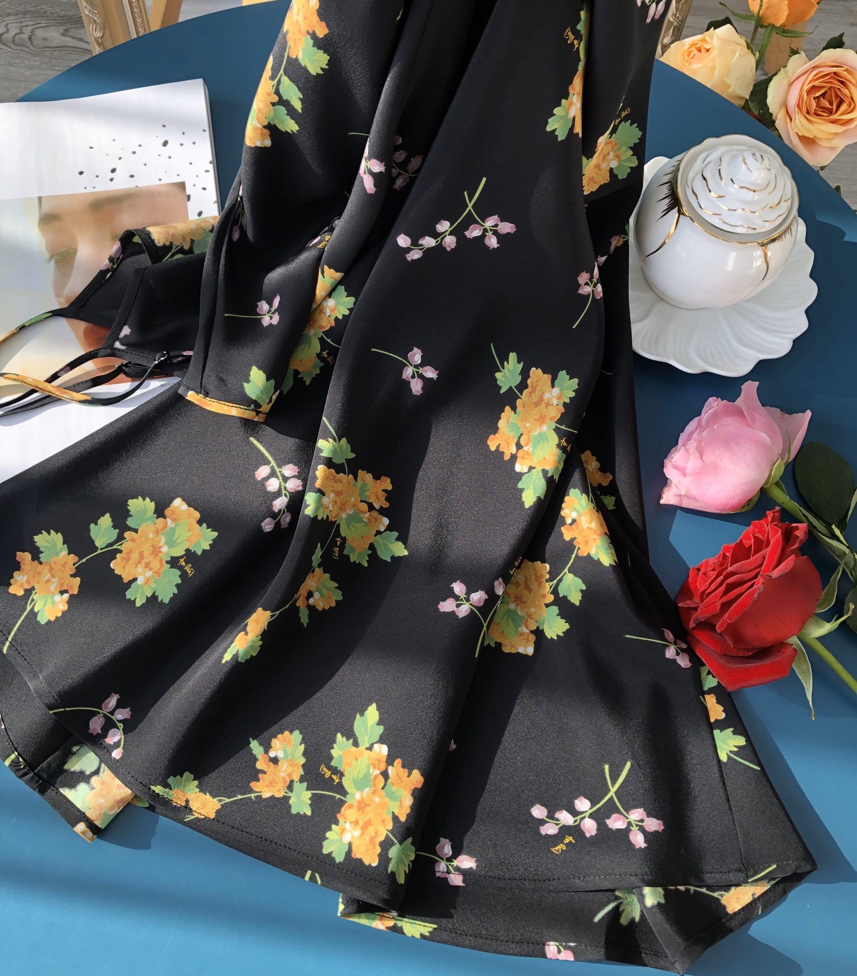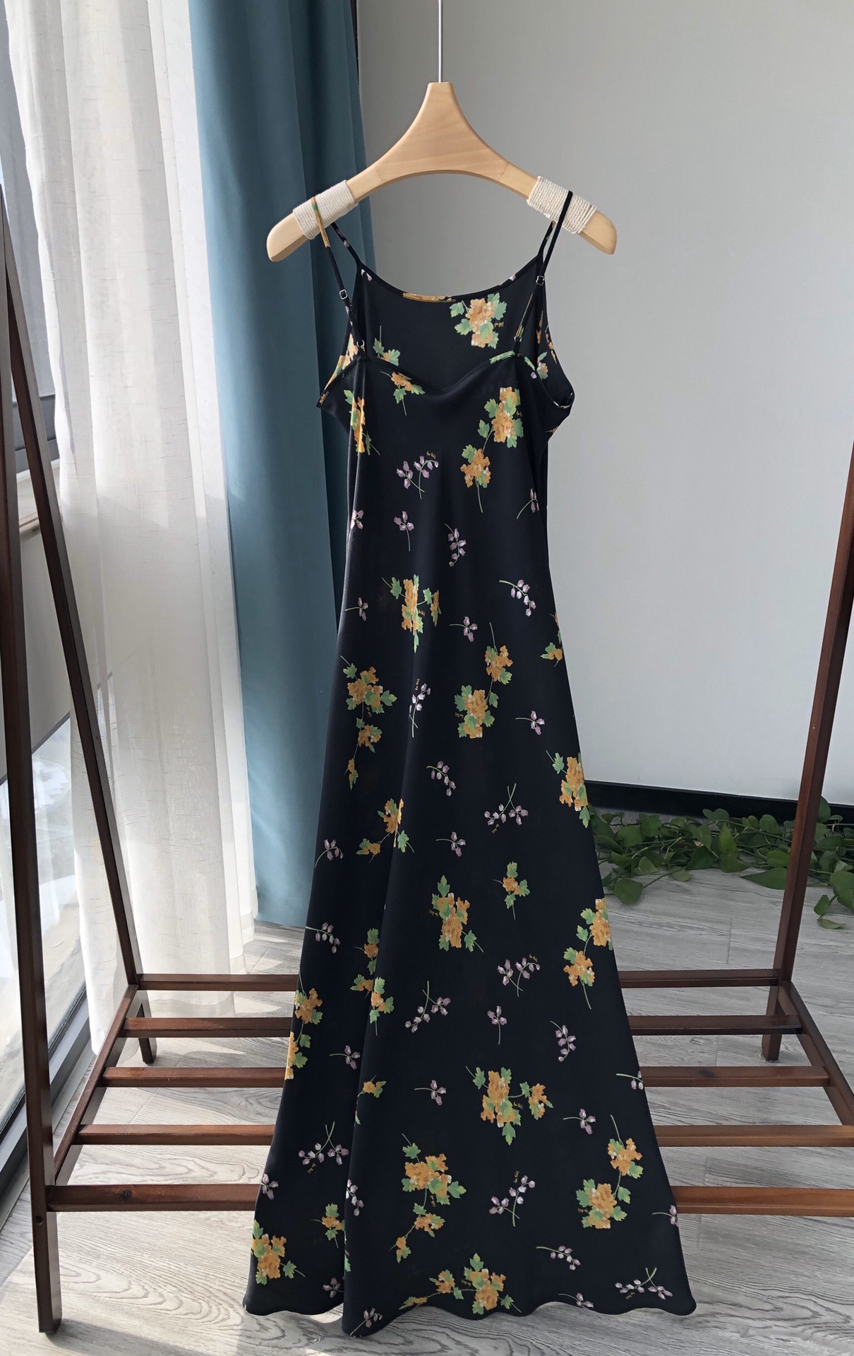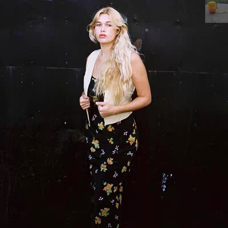 Minimalist route pays more attention to the sense of curves, silk wind chime flower printed suspender long dress