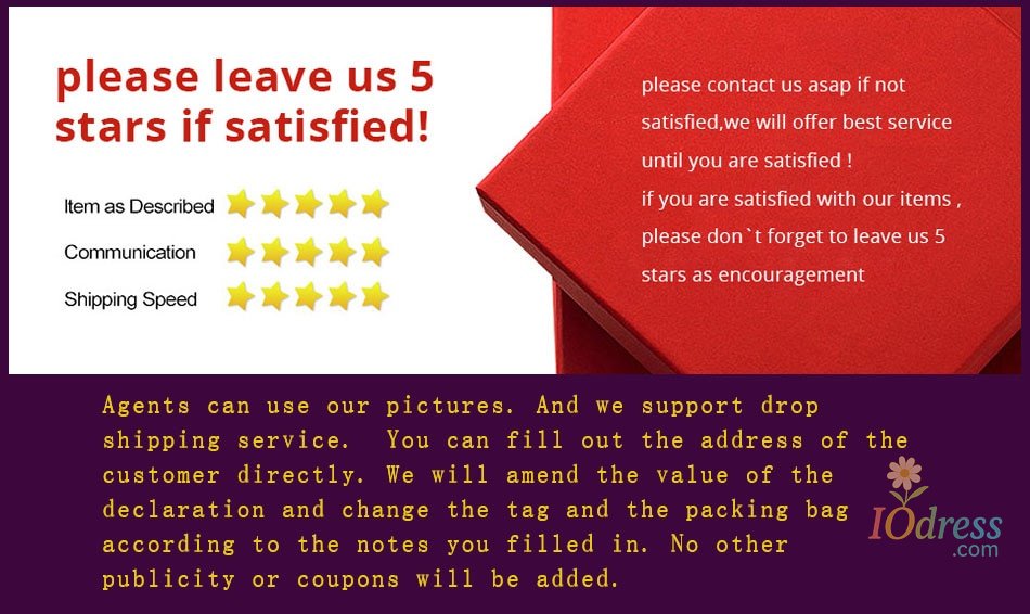 3) PO Box is not accepted if you choose express shipping. Your address should be detailed enough, even include apartment or unit number. Nondelivery or extra shipping fee due to personal reasons will not be taken by Iodress.com.