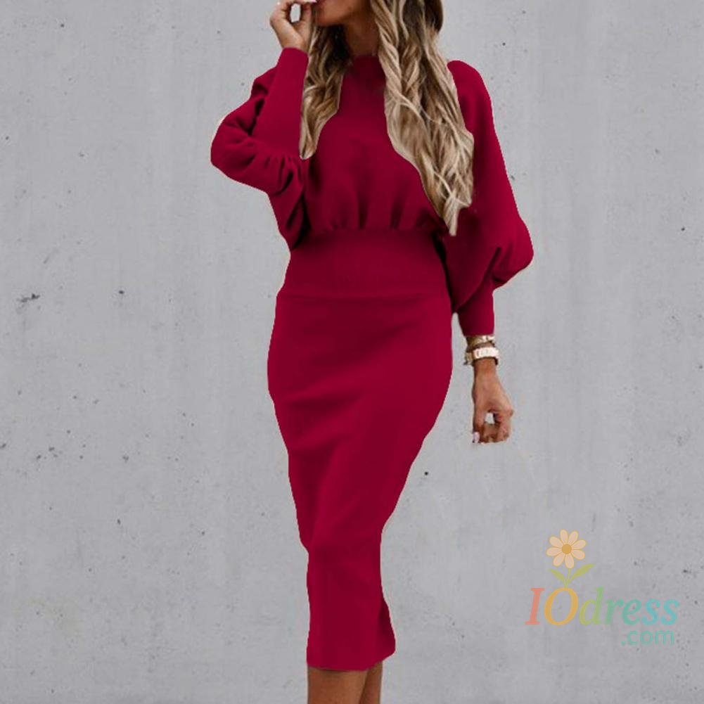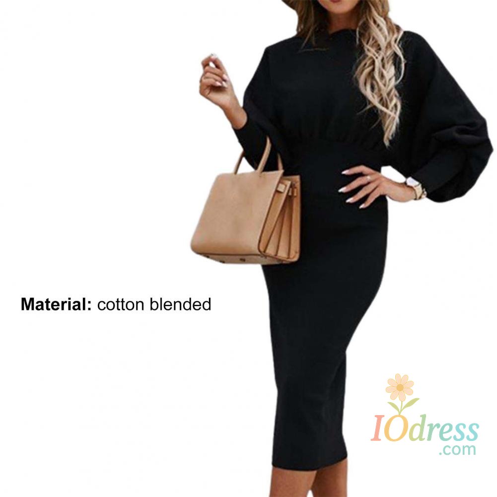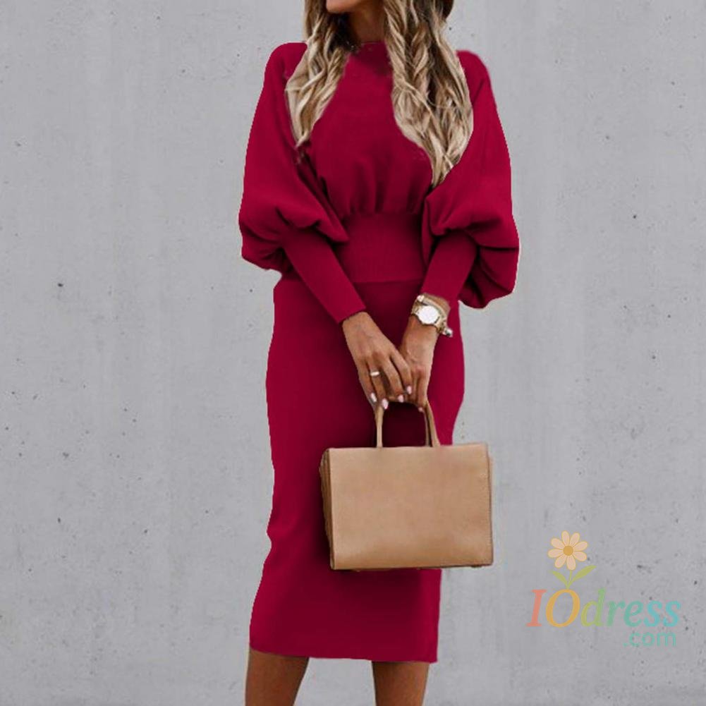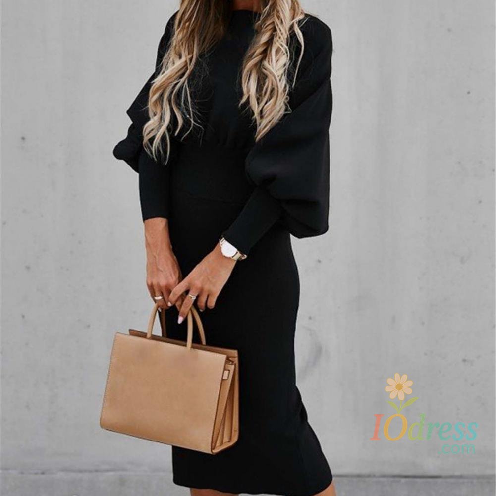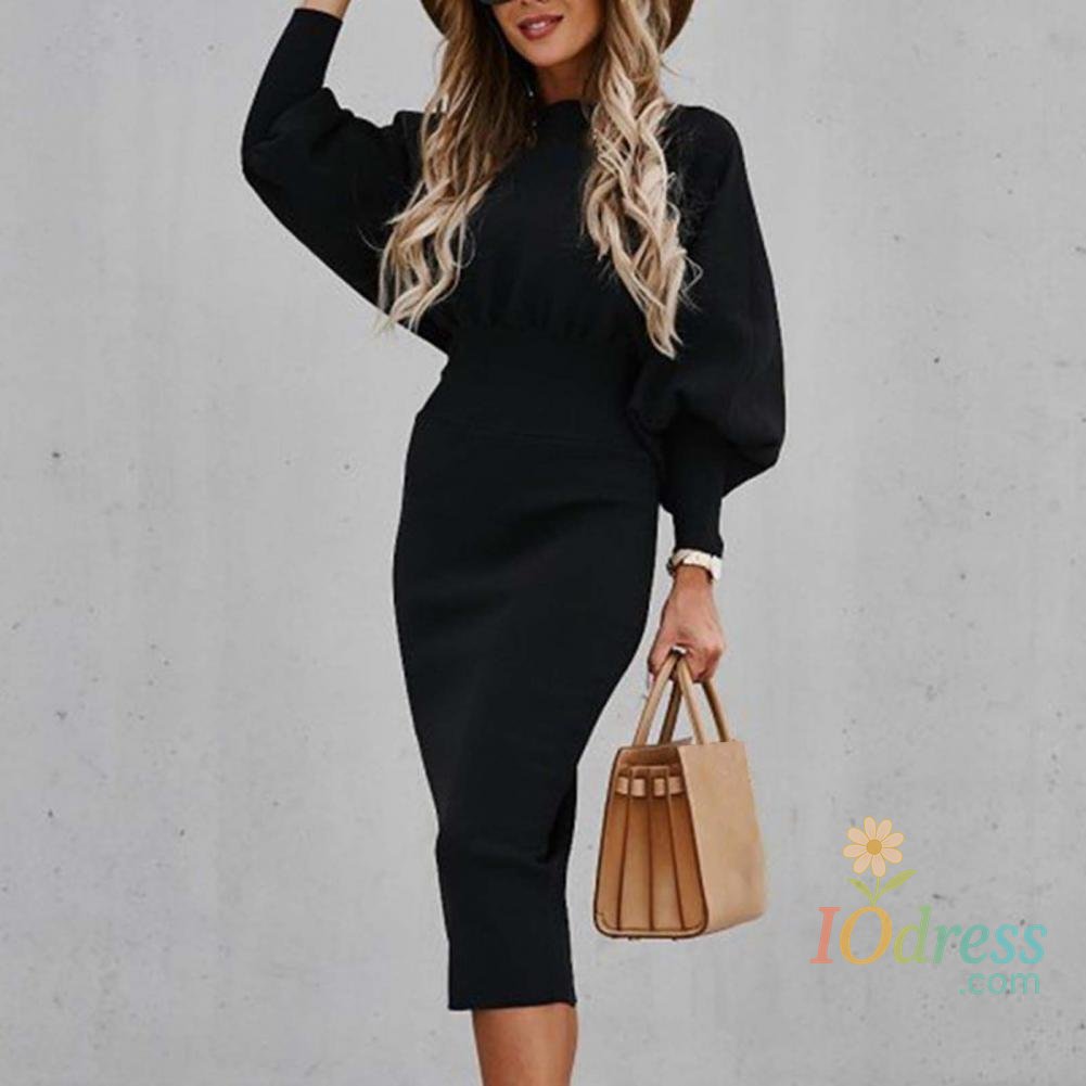 IO Dress Lantern Sleeve Women Bodycorn Dress High Waist Elegant Party Dress Solid Color Office Lady Dress Autumn Winter Slim Midi Dress