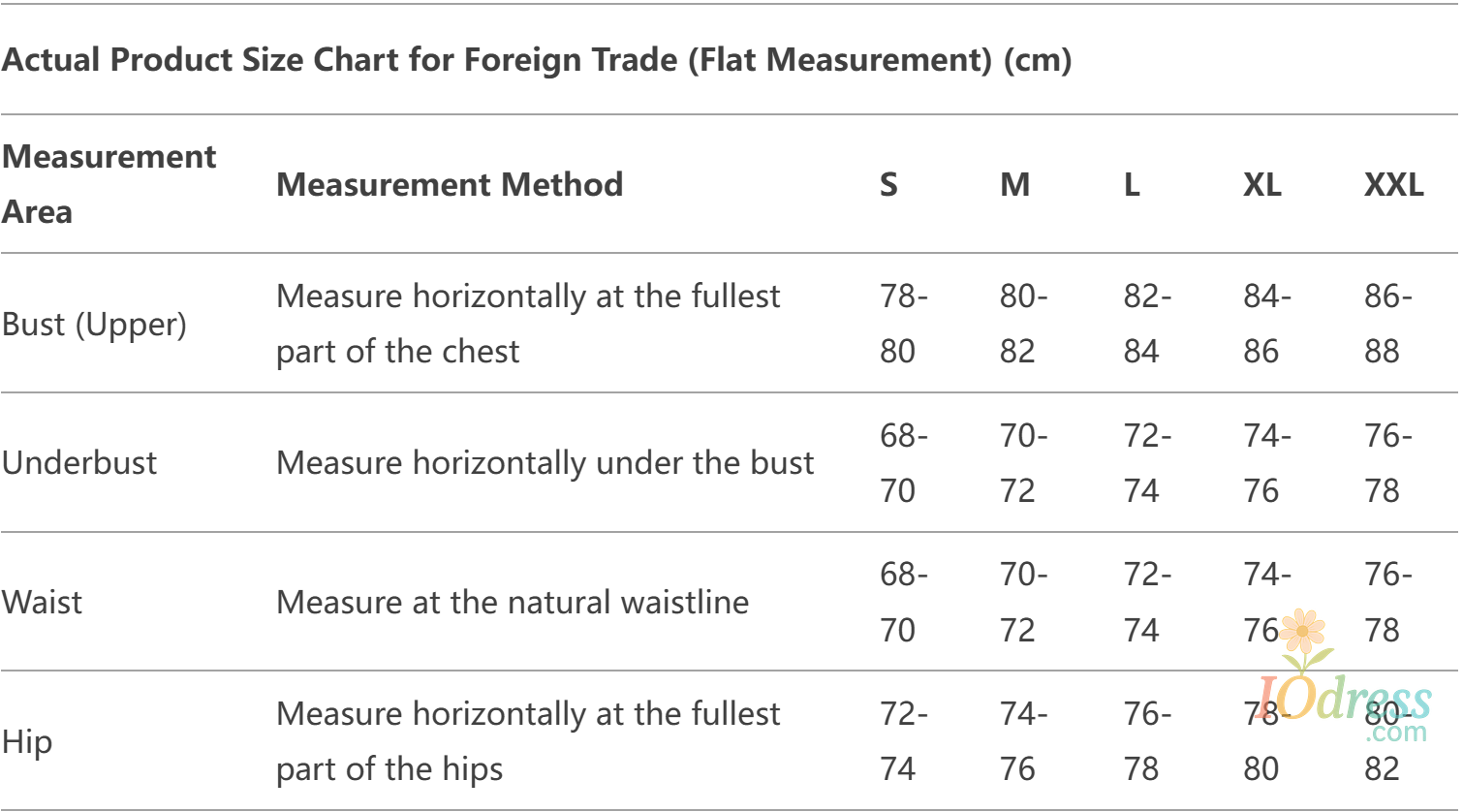 This chart provides the measurements for different sizes (S, M, L, XL, XXL) based on the bust, underbust, waist, and hip measurements.
